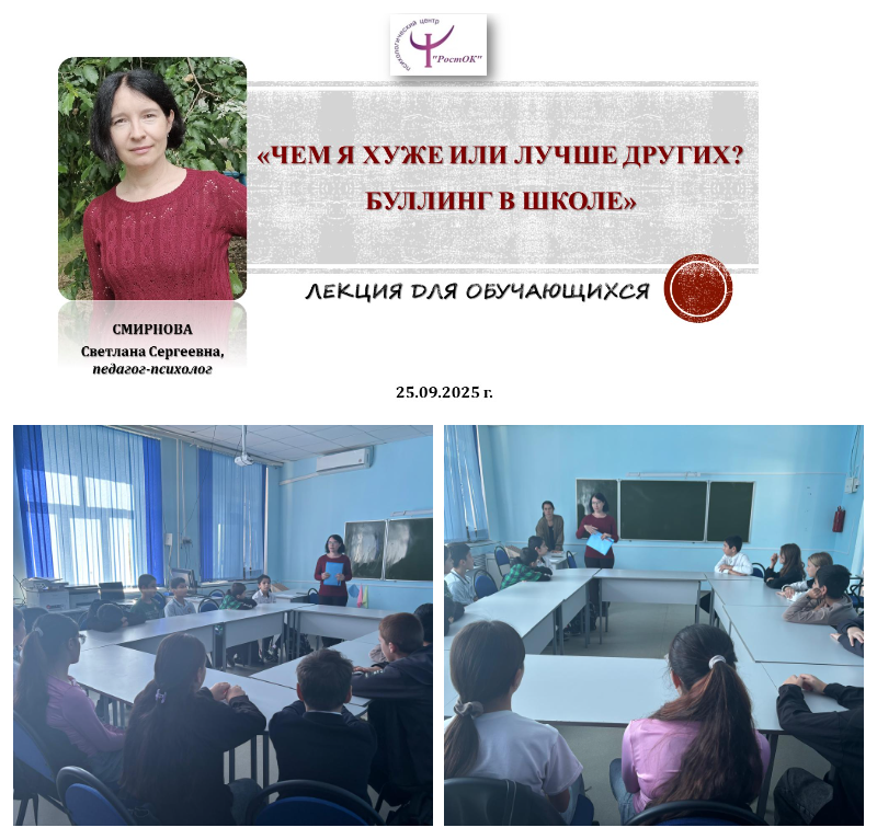 25 сентября 2025 года в МОУ СОШ № 12 посёлка Терек Будённовского муниципального округа педагог-психолог ГБОУ ЦППРК «РостОК» Смирнова Светлана Сергеевна провела лекцию для обучающихся основного уровня обучения на тему: «Чем я хуже или лучше других? Буллинг в школе».